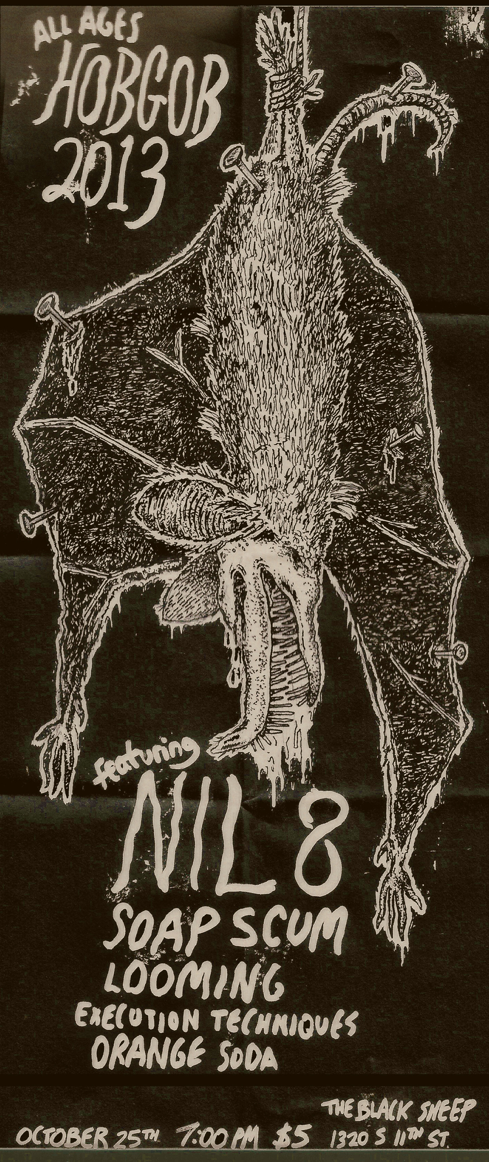 Earlier we announced our big Halloween show happening at Black Sheep on October 24th featuring Don’t Mess With Winkie, Los Injectors, Bad Banshee, and King Worm. NIL8‘s legendary Hobgoblinspookadelic will not be happening at Black Sheep this year, but instead just at Donnie’s Homespun. The date for that will be on Halloween, Friday October 31st. For that show there is another great local lineup. NIL8 will be playing (of course) along with long running Springfield punk band The Timmys. They will be joined by newer Springfield hardcore/punk/ska bands Bad Banshee and King Worm. For photos of last year’s Hobgob you can check out our Hobgob 2013 album on flickr.