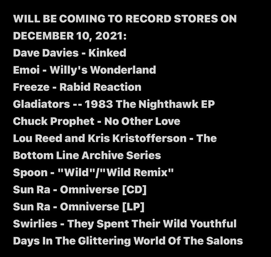 We also have this list printed off in our store for you to look at and help us know what to order the most of by placing small check marks next to items you know you are going to want. Our store will open at 8:00 am on that day like we do for every Record Store Day, and we will likely have an exclusive shirt printed for the first people that are in line. It looks like Recycled Records will be participating to some extent as well, in their latest announcement they have extended the closing of their store and sales to the end of April.