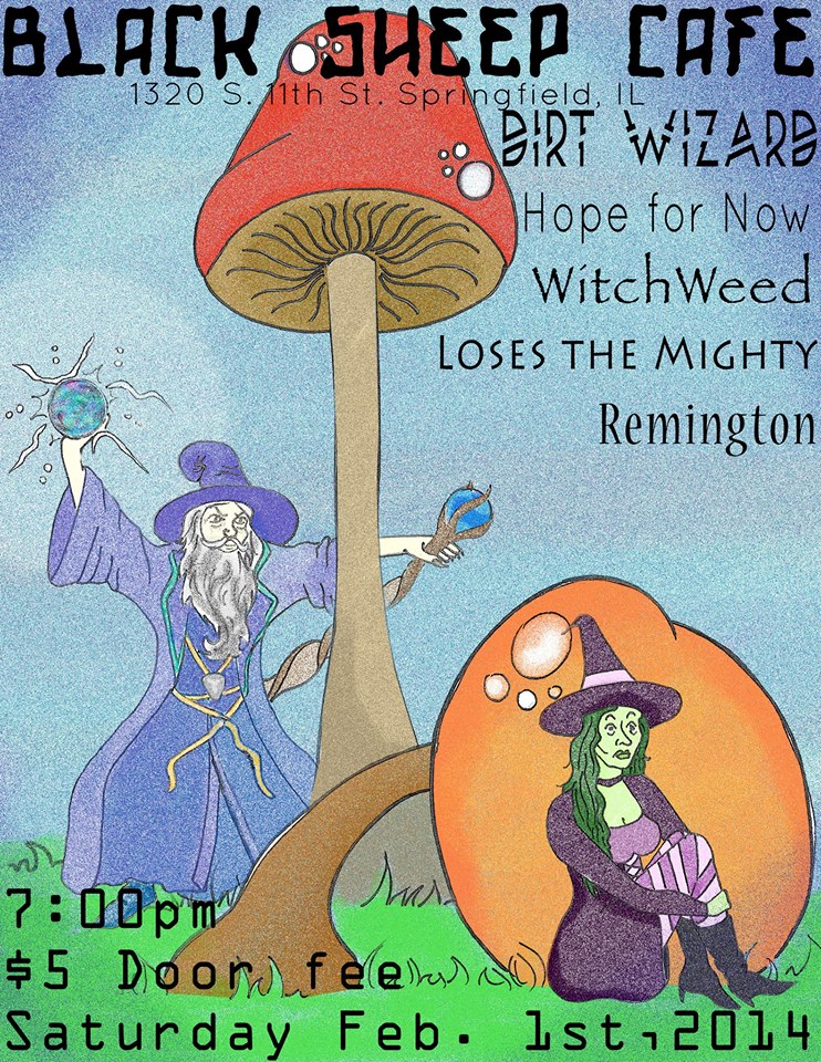 Happy New Year everyone! 2014 is going to be a very busy year for Black Sheep and South Town, with the coming of Dumb Records in just a few days, and a new recording studio/practice space. Here is a show happening on Saturday, February 1st. It features a new stoner/rock band Dirt Wizard from Peoria, Illinois. You can check out some of their heavy tunes on the player below. Then we have Central Illinois post-hardcore band Hope For Now. This show will also feature the return of Witchweed to Black Sheep. They play doom/stoner/sludge and come from the cities of Taylorville and Pawnee. The show will also feature Central Illinois band Loses The Mighty, who are also playing January 24th at Black Sheep. To top that all off we have Remmington, a newer Chicago-area band featuring members of NEED.