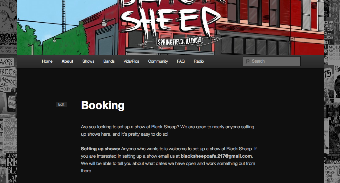 Screen shot 2013-05-01 at 9.27.06 AMIt’s maybe been a little while since we have added any new pages or features to the Black Sheep site. Today we are launching a new page on the site called “Booking.” The page is fairly simple- we want to guide bands looking for shows in our area and people trying to book shows at Black Sheep in the right direction. We always have our booking email set up as blacksheepcafe.217@gmail.com.