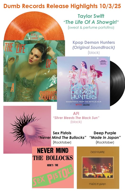 – TAYLOR SWIFT with her 12th studio album “The Life Of A Showgirl” – we will have copies on “sweat & perfume portofino” vinyl (orange glitter) and also CD at both stores. (crossing our fingers that these show up in time, it could be a case where they show up during the day tomorrow)